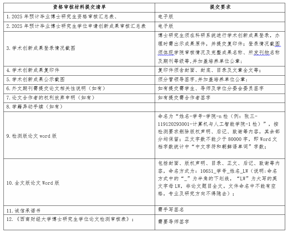 提交博士研究生学位申请资格审核材料须严格按下列清单整理(如学术创新成果预计在2025年9-11月正式发表,请联系学院),具体包括: