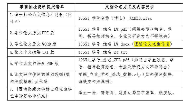 博士毕业生资格审核通过、预答辩通过后,学院(研究院)收取博士学位论文,于9月25日-9月26日将博士学位论文事前抽检相关资料刻录光盘,提交学位办。员工需在2025年9月23日17:00前,提交修改后的学位论文及以下材料,具体包括: