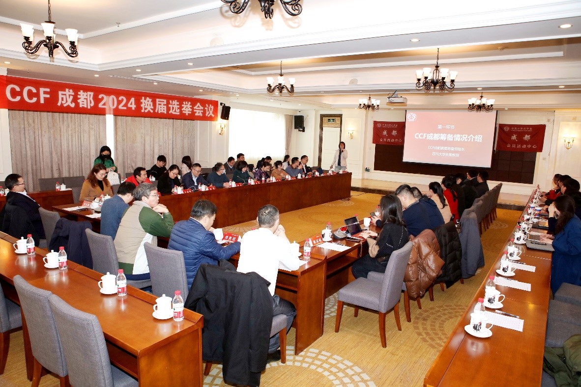 2024年1月7日,中国计算机学会(CCF)成都会员活动中心(简称“CCF成都”)在四川省成都市威廉希尔足球官网光华校区住友苑宾馆召开了换届选举会议,CCF秘书长唐卫清、助理秘书长陈国威和来自成都各高校、企事业单位的40余名CCF成都委员、会员代表参会。学院副经理杨新当选为新一届CCF成都秘书长,副经理刘家芬当选为监督委员会委员。