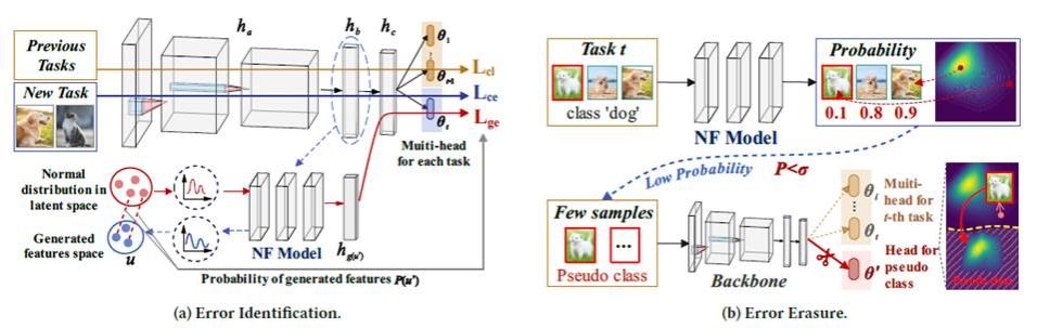 本文提出了一个全新的视角:持续学习(Continual Learning, CL)不仅需要防止遗忘,还应具备“刻意遗忘”的能力。该观点源于现有 CL 方法普遍忽视现实世界数据中的偏差,进而导致模型学习到可迁移并在任务间不断放大的伪相关性。通过对特征提取过程和预测结果的深入分析,发现数据偏差会同时削弱 CL 在知识保留与迁移方面的能力。为应对此问题,本文提出了一个通用插件模块 ErrorEraser,用于擦除 CL 中由数据偏差引发的错误记忆,从而提升模型在新旧任务中的整体性能。ErrorEraser 包含两个核心模块:错误识别与错误擦除。前者无需任何先验知识,即可学习任务数据在特征空间中的概率密度分布,从而精确识别潜在的偏差样本;后者则通过定向调整代表性异常样本的决策边界,实现对错误知识的精准擦除。此外,本文还设计了一种增量式特征分布学习策略,有效降低了在下游任务中执行错误识别时的资源开销。