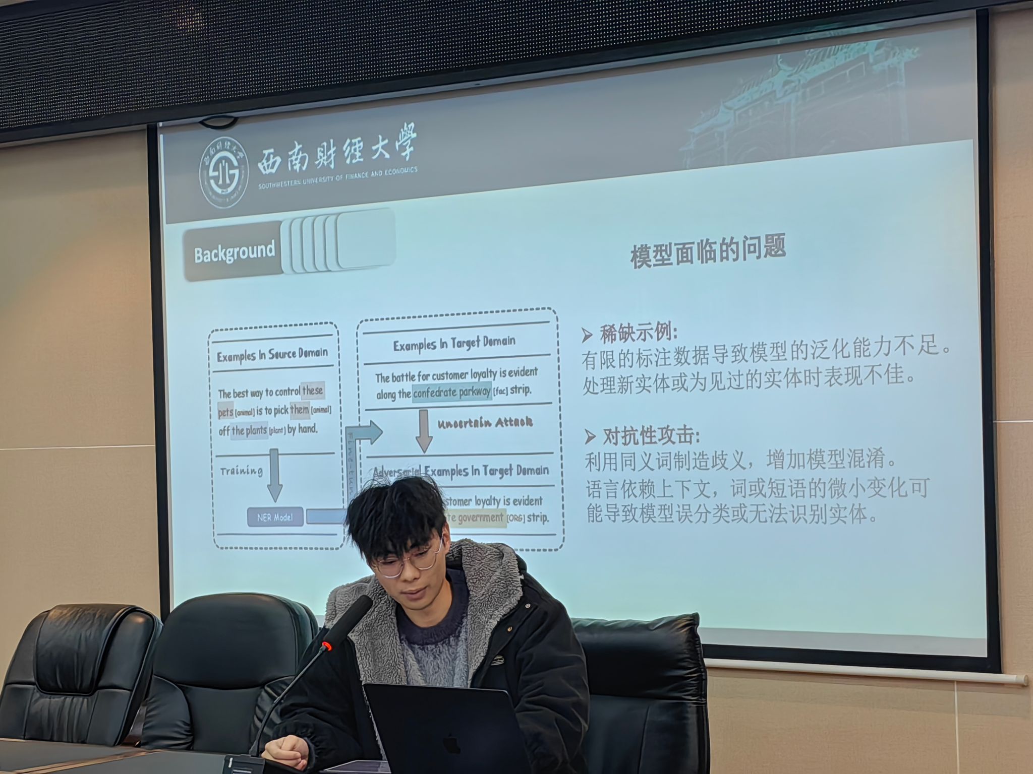 接下来,刘昊文以“基于内容提示增强的少样本命名实体识别研究”为主题,分享了他在少样本学习领域的最新研究成果。他详细介绍了该模型的具体实现细节,包括如何通过内容提示增强技术提升模型的学习效率和泛化能力。刘昊文介绍到少样本命名实体识别是当前人工智能领域的热点问题,具有广泛的应用前景,尤其是在数据稀缺的场景下,该技术能够显著提升模型的表现。刘昊文的分享不仅为同学们提供了前沿的科研视角,还激发了大家对少样本学习领域的兴趣。他鼓励同学们在科研中勇于探索新方法,尤其是在面对数据稀缺等挑战时,大胆尝试通过技术创新来解决问题。
